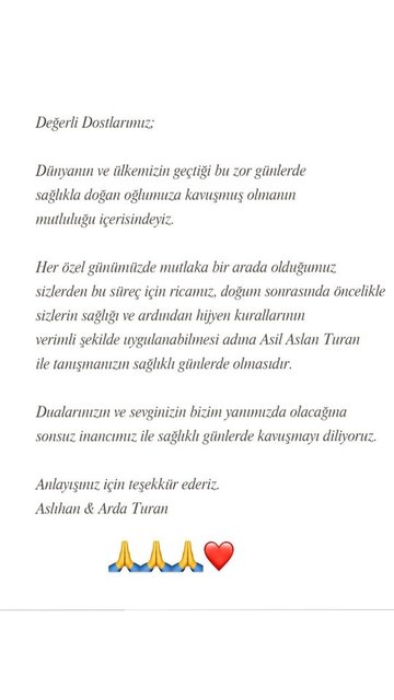 Dualarınızın ve sevginizin bizim yanımızda olacağına sonsuz inancımız ile sağlıklı günlerde kavuşmayı diliyoruz. Anlayışınız için teşekkür ederiz. Aslıhan & Arda Turan...