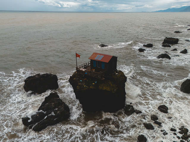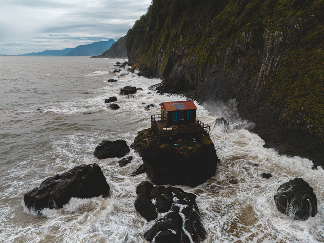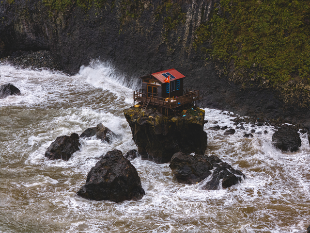 Artvin'in Arhavi ilçesinde deniz kıyısındaki dev kayanın üzerine yapılan ahşap ev görenleri hayrete düşürüyor.
