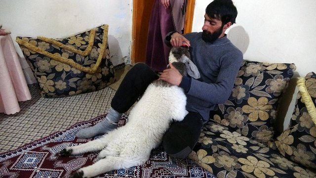 Hakkari'nin Yüksekova ilçesinde 3 ay önce arka ayakları felçli olarak doğan ve 'Boncuk' ismi verilen kuzuya ev ortamında çocuklar gibi bakılıyor
