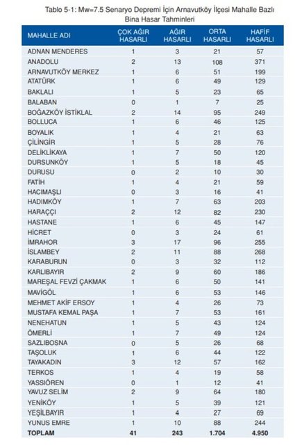 Buna göre Mw=7.5 büyüklüğündeki senaryo depreminde, Arnavutköy’deki binaların ortalama yüzde 78’inin hasar görmeyeceği tahmin edilmektedir. Binaların ortalama yüzde 15’inin hafif, yüzde 5’inin orta, yüzde 1’inin ağır ve yüzde 1’inin de çok ağır hasar görmesi beklenmektedir.