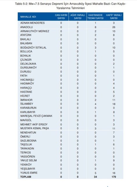 Mw=7.5 büyüklüğündeki senaryo depreminin, en kötü senaryo olan gece meydana gelmesi halinde, Arnavutköy’de can kaybı ve ağır yaralı olmayacağı ve 34 kişinin de hastane şartlarında tedavi görmesi gerekebileceği öngörülmektedir.