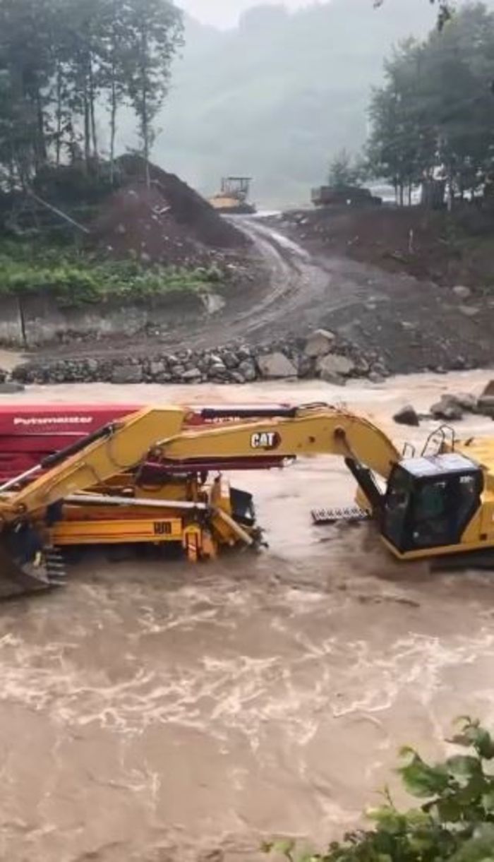 Bu sırada dere yatağında çalışan bir beton pompası ve bir ekskavatör, yükselen suyun ortasında kaldı. İş makineleri operatörleri durumu fark ederek araçlardan zamanında uzaklaşırken, olayda herhangi bir yaralanma yaşanmadı.