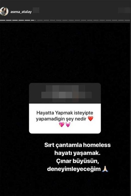 Kendisine yöneltilen ‘Hayatta yapmak isteyip de yapamadığın şey nedir?’ sorusuna “Sırt çantamla homeless (evsiz-sokakta yaşayan) hayatı yaşamak. Çınar büyüsün, deneyimleyeceğim” yanıtını veren Asena Atalay böylelikle geleceğe yönelik ilginç planını da açıklamış oldu.