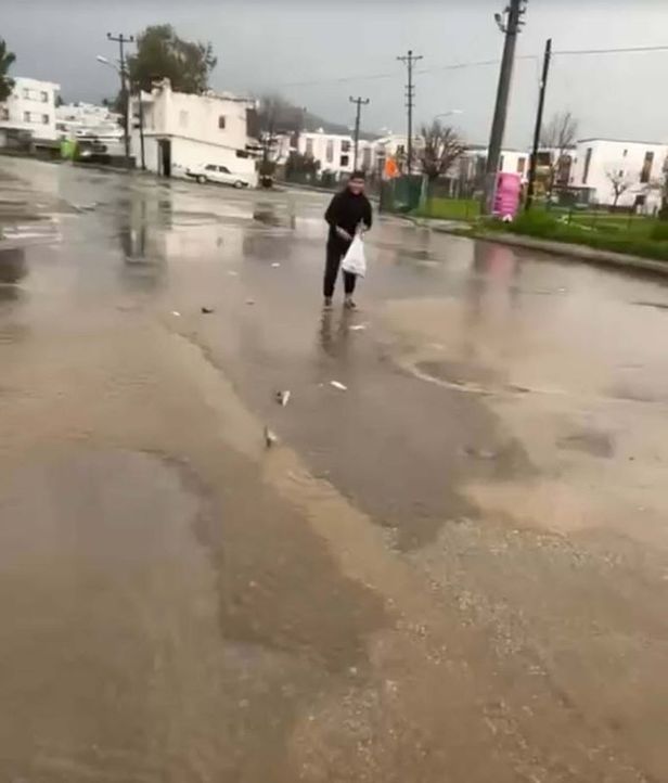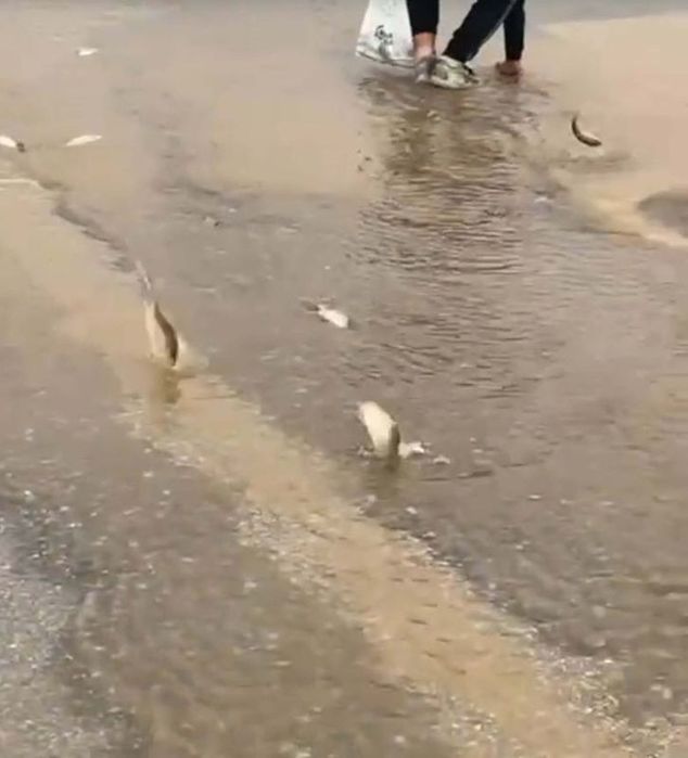 Göletten taşan sularla birlikte balıklar da asfalta sürüklendi. Vatandaşlar yoldaki balıkları tek tek topladı. Bu anlar cep telefonu kamerasıyla kaydedildi.