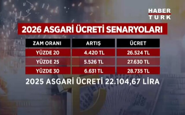 Net asgari ücret, yüzde 20 zamla 26.525 TL, yüzde 25 zamla 27.630 TL, yüzde 30 zamla 28.736 TL, yüzde 35 zamla ise 29.841 TL olacak.