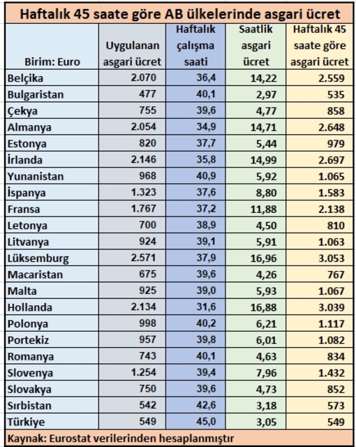 En düşük saatlik asgari ücret sıralamasında Sırbistan’dan sonra 4,26 euro ile Macaristan, 4,50 ile Letonya, 4,63 ile Romanya, 4,73 ile Slovakya, 4,77 euro ile de Çekya geliyor.