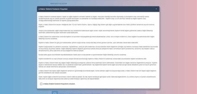 Giriş yaptığınızda profil bilgilerinizi oluşturmak için yönlendirildiğiniz ilk ekranda Kullanım Şartları bulunmaktadır. Profilinizi oluşturmaya başlamak için “e-Nabız Sistemi kullanım koşullarını okudum” yazısının yanında bulunan kutucuğu işaretlemeniz gerekmektedir. (Şekil3).