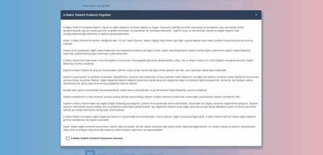 Giriş yaptığınızda profil bilgilerinizi oluşturmak için yönlendirildiğiniz ilk ekranda Kullanım Şartları bulunmaktadır. Profilinizi oluşturmaya başlamak için “e-Nabız Sistemi kullanım koşullarını okudum” yazısının yanında bulunan kutucuğu işaretlemeniz gerekmektedir. (Şekil3).