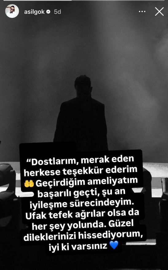Müzisyen, geçirdiği operasyon sonrası sağlık durumu hakkında bilgi verdi. Asil Gök; "Dostlarım, merak eden herkese teşekkür ederim Geçirdiğim ameliyatım başarılı geçti, şu an iyileşme sürecindeyim. Ufak tefek ağrılar olsa da her şey yolunda. Güzel dileklerinizi hissediyorum, iyi ki varsınız" dedi.