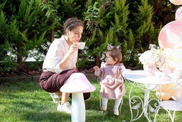 Oyuncu Aslı Tandoğan, kızı Arya'nın bir yaş doğum günü için önceki gün çay partisi düzenledi