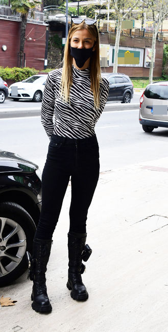 Aslı Turanlı, birçok cebi olan botunu soran basın mensuplarına, "Onlara dezenfekte spreyleri koyuyorum. Sosyal mesafeyi geçenlere sıkıyorum" diyerek espiri yaptı.