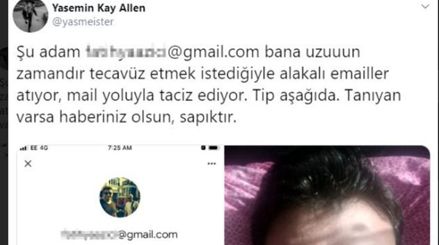 Ünlü oyuncu Yasemin Allen, kendisini mail yolu ile taciz eden sapığı sosyal medya üzerinden ifşa ederek, "Bu sapığın paylaşamayacağım kadar ağır tacizleri var. Anne babalar evlatlarınızı iyi yetiştirin! Sonra dikkat çekmek için bir kadını taciz ediyorlar" demişti.