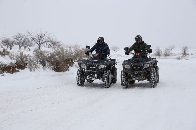 Ortaya çıkan eşsiz manzarada, soğuk havaya aldırmadan Kapadokya'yı gezmek isteyen turistler, at, arazi motorları ve araçlarıyla düzenlenen turlara ilgi gösteriyor.