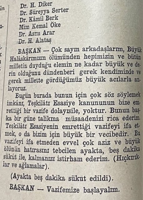Türkiye Cumhuriyeti'nin kurucusu ve ilk Cumhurbaşkanı Mustafa Kemal Atatürk'ün vefatının ardından Meclis'teki ilk anma, 11 Kasım günü yeni cumhurbaşkanını seçmek üzere toplanan TBMM Genel Kurulunda yapıldı. Milletvekilleri, 'hıçkırıklar ve ağlama sesleri' arasında 5 dakika süreyle sükut ile kaldı...