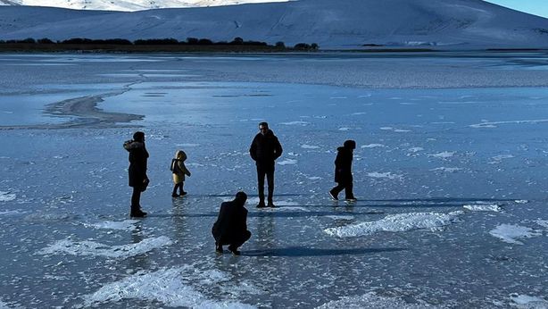 Gölün yaklaşık yüzde 10'luk bölümünü oluşturan buzla kaplı alan yerli misafirlerin ilgisini çekti. Bölgeye gelen misafirler, buz kalınlığının 10 santimetreye ulaştığı göl yüzeyinde hem yürüdü hem de bol bol fotoğraf çekildi.