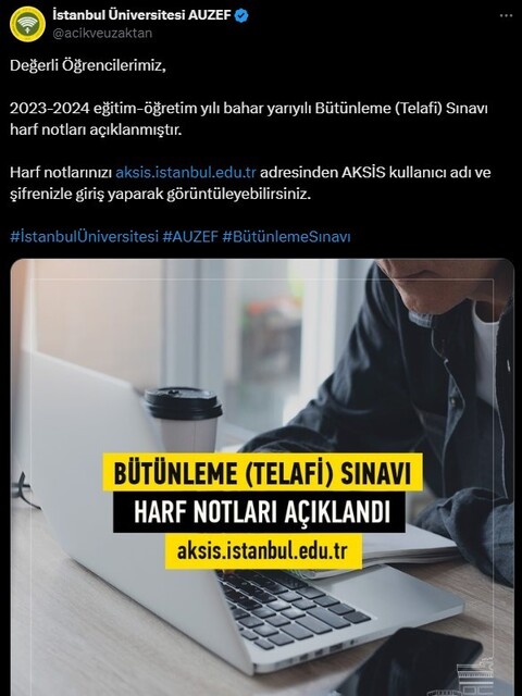 AUZEF bütünleme telafi sınavı harf sonuçları açıklandı! İstanbul Üniversitesi AUZEF bütünleme/telafi sonuçları sorgula