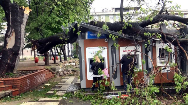 Avcılar´da çürüyen bir ağaç, 4 ATM kabininin üzerine devrildi. Ağacın kırılmasına aldırış etmeyen müşteriler ATM'den para çekmeye devam etti.