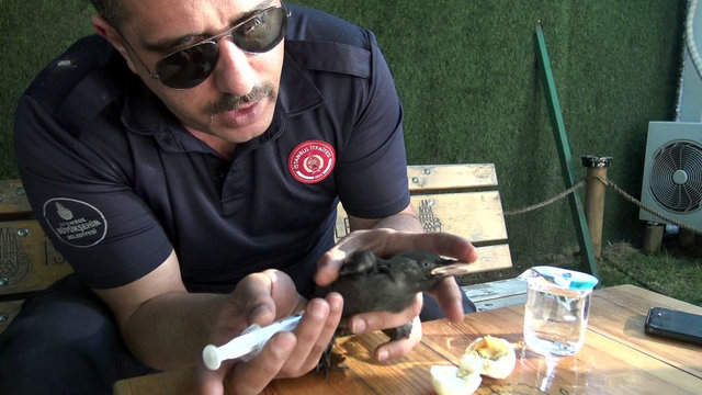 Avcılar'da yavru kuzgun, düştüğü havalandırma boşluğundan kendisini kurtarıp, su ve yiyecek veren itfaiyeci Hakan Kalın'ın yanından bir saniye bile ayrılmıyor.