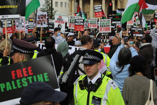 Polis, Filistin'e destek yürüyüşünün sona ermesinin ardından bazı grupların Trafalgar Meydanı ve elçilik çevresine yürümesi üzerine bu noktalarda güvenlik önlemlerini artırdı. Trafalgar Meydanı'ndaki gözaltılar sırasında polisle eylemciler arasında gerginlik yaşandı.