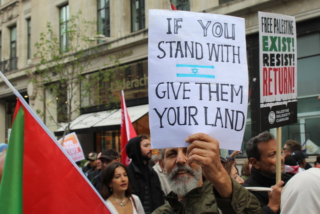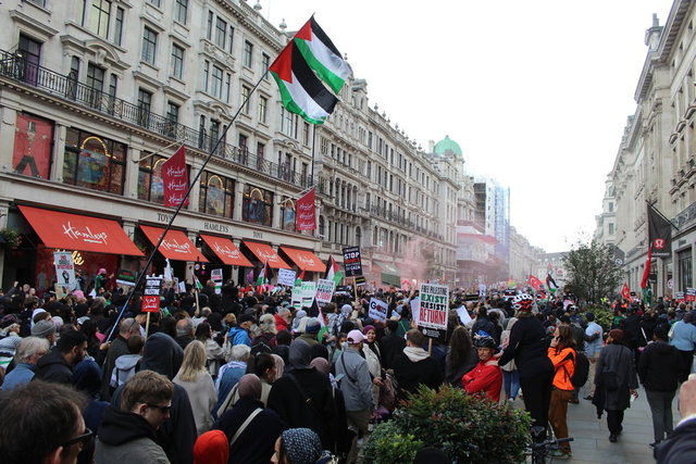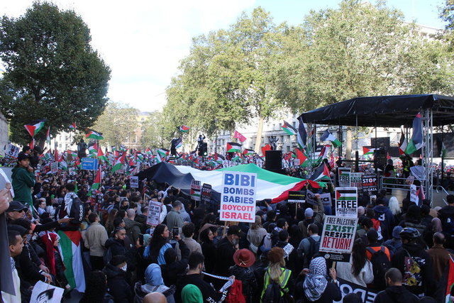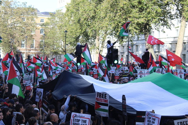 İngiltere'nin başkenti Londra'da 14 Ekim'de on binlerce kişi "Filistin ile dayanışma göstermek ve İngiliz hükümetinin İsrail-Filistin çatışmasında Filistinlilerin haklarına karşı sessiz tutumunu protesto etmek" amacıyla İngiliz yayın kuruluşu BBC genel merkezi önünde toplandı.