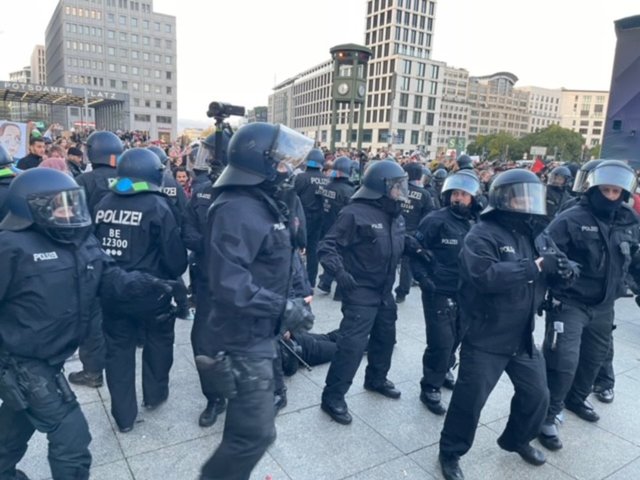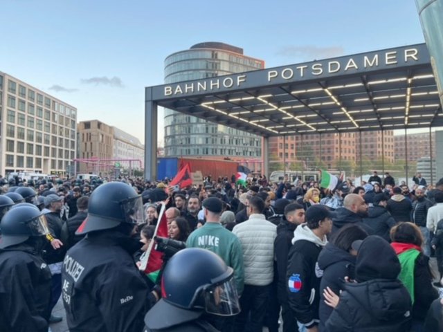 Polisin yasağına rağmen, aralarında Filistinlilerin de bulunduğu bir grup, 14 Ekim'de polise "Orta Doğu'da barış-Orta Doğu'da ateşkes-İki devletli çözüm" sloganıyla gösteri yapmak için başvurduktan sonra kent merkezindeki tarihi Brandenburg Kapısı'nın önündeki meydanda toplandı.