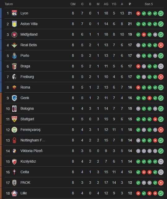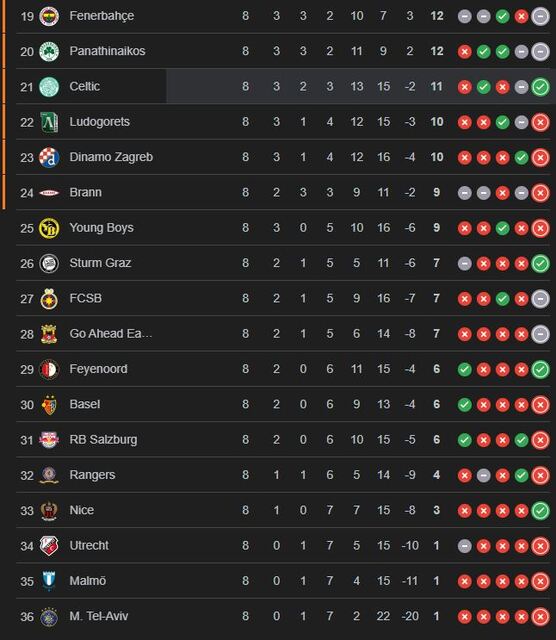Fenerbahçe UEFA Avrupa Ligi'nde topladığı 12 puanla 19. sırada yer alıyor.