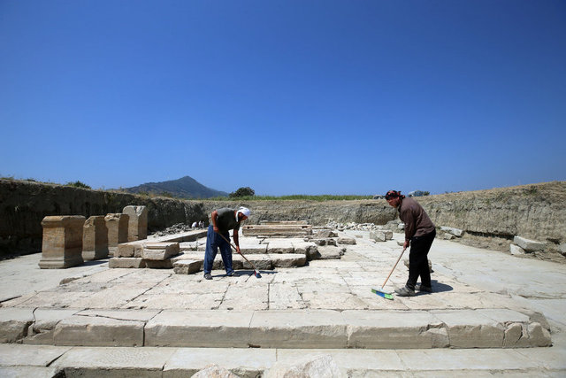 Aydın'ın Germencik ilçesindeki Magnesia Antik Kenti'nde yeniden ayağa kaldırma çalışmaları süren Zeus Tapınağı'nın sunak bölümü ortaya çıkarıldı