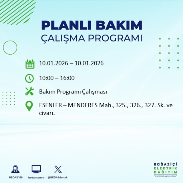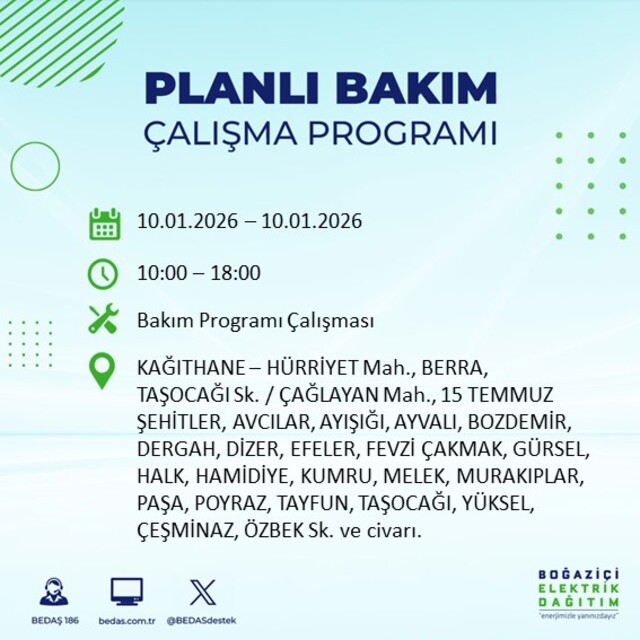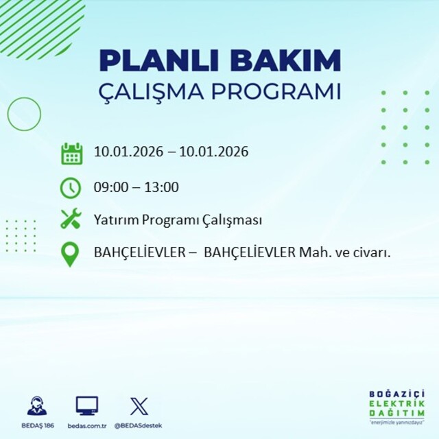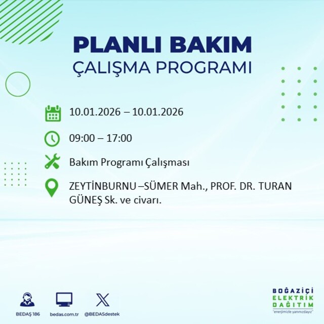 Boğaziçi Elektrik Dağıtım A.Ş tarafından yapılan duyuruya göre 10 Ocak 2026 Cumartesi günü İstanbul'da farklı saat aralıklarında elektrik kesintileri uygulanacak.