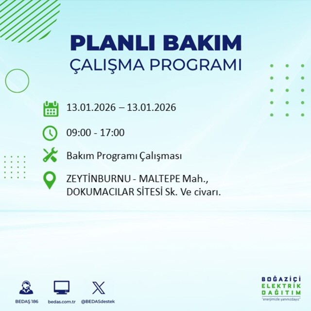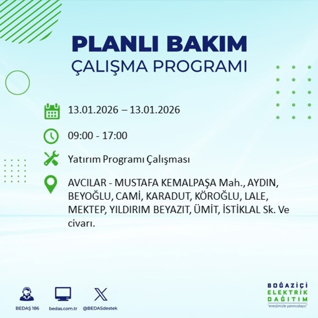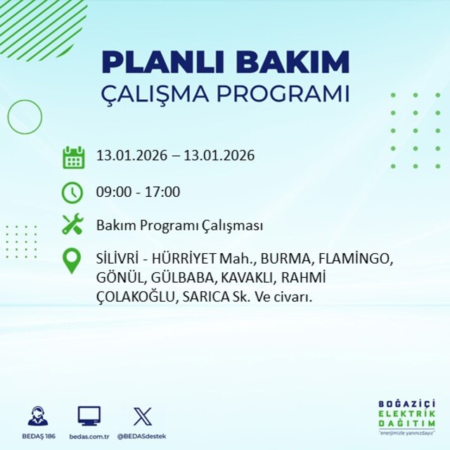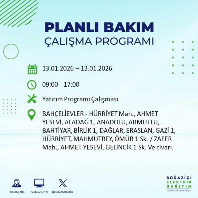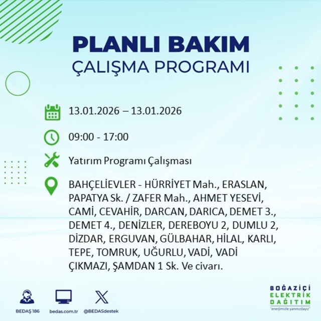 Boğaziçi Elektrik Dağıtım A.Ş tarafından yapılan duyuruya göre 13 Ocak 2026 Salı günü İstanbul'da farklı saat aralıklarında 12 ilçede elektrik kesintileri uygulanacak. İşte elektrik kesintisi uygulanacak ilçeler listesi