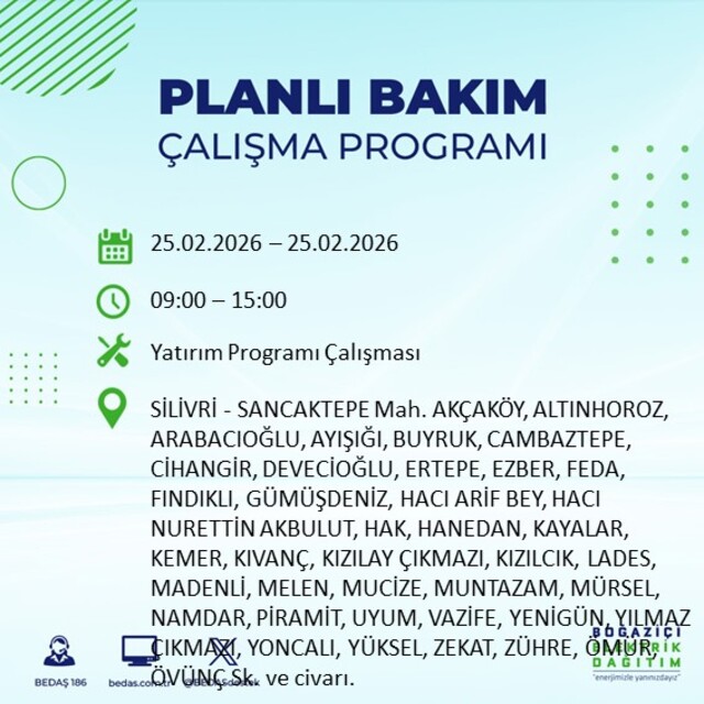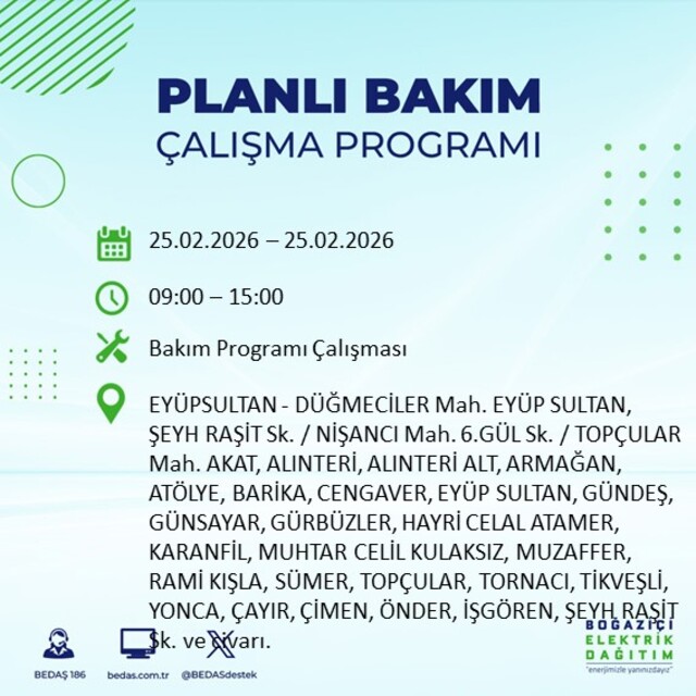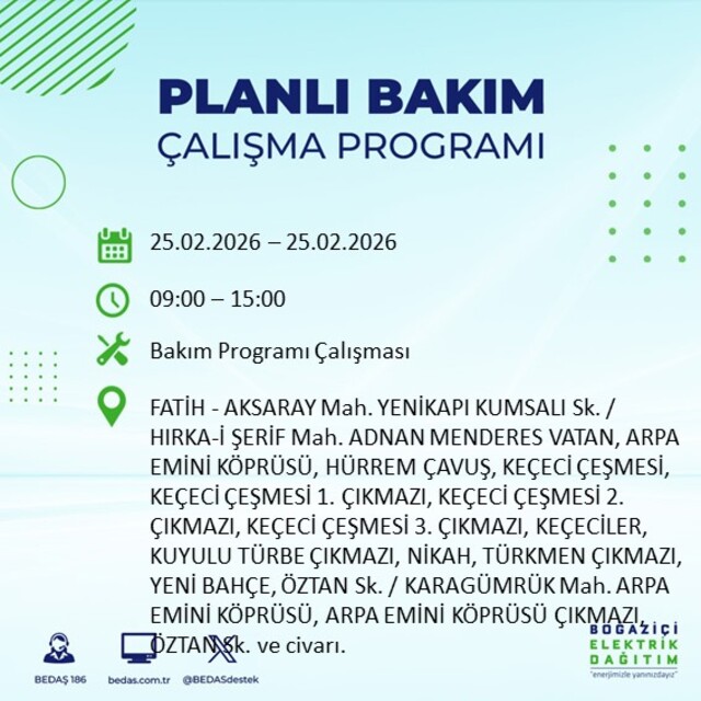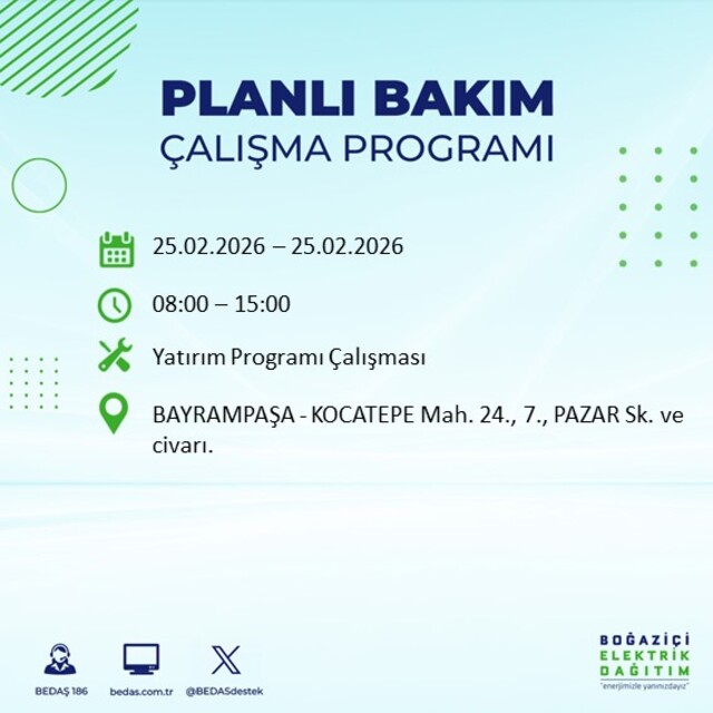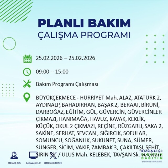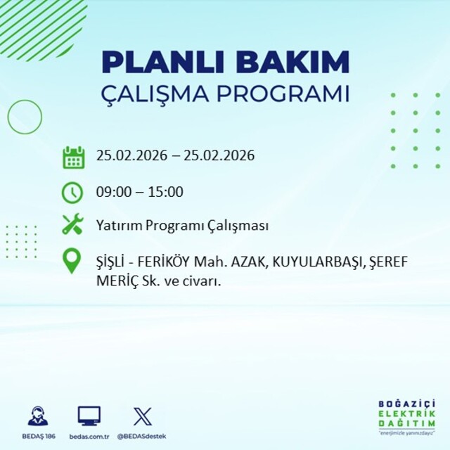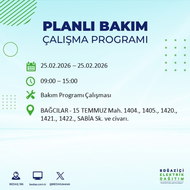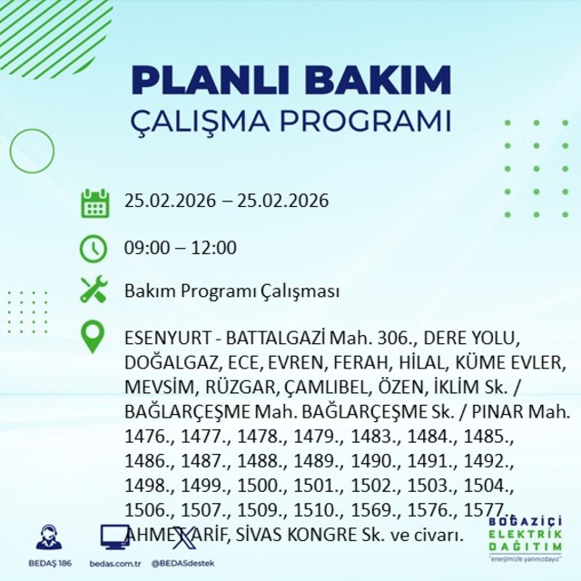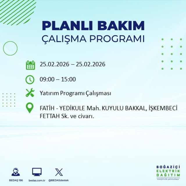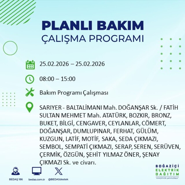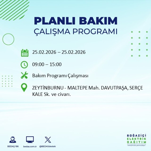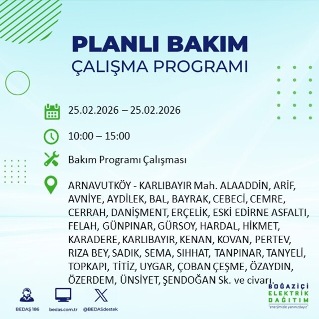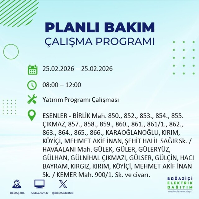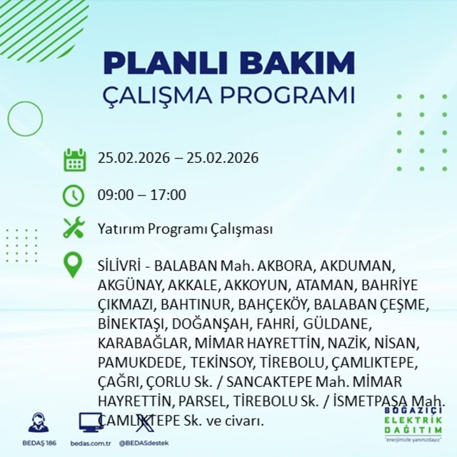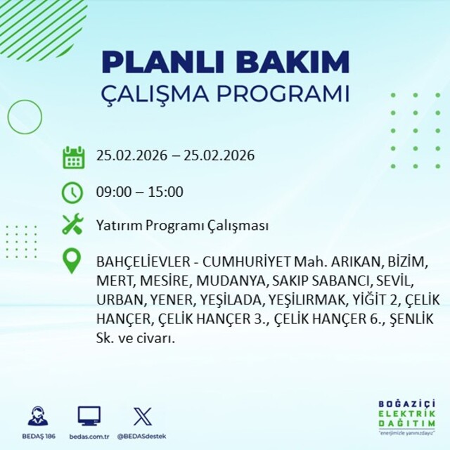 Boğaziçi Elektrik Dağıtım A.Ş tarafından yapılan duyuruya göre 25 Şubat 2026 Çarşamba günü İstanbul'da farklı saat aralıklarında elektrik kesintileri uygulanacak. İşte elektrik kesintisi yaşanacak ilçeler