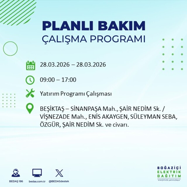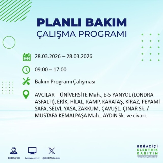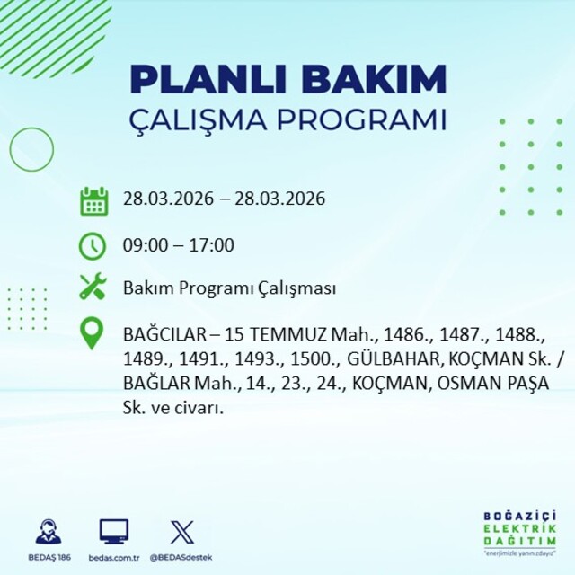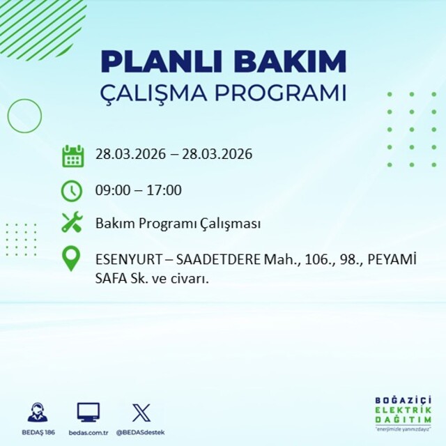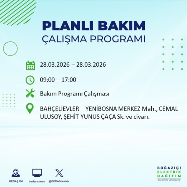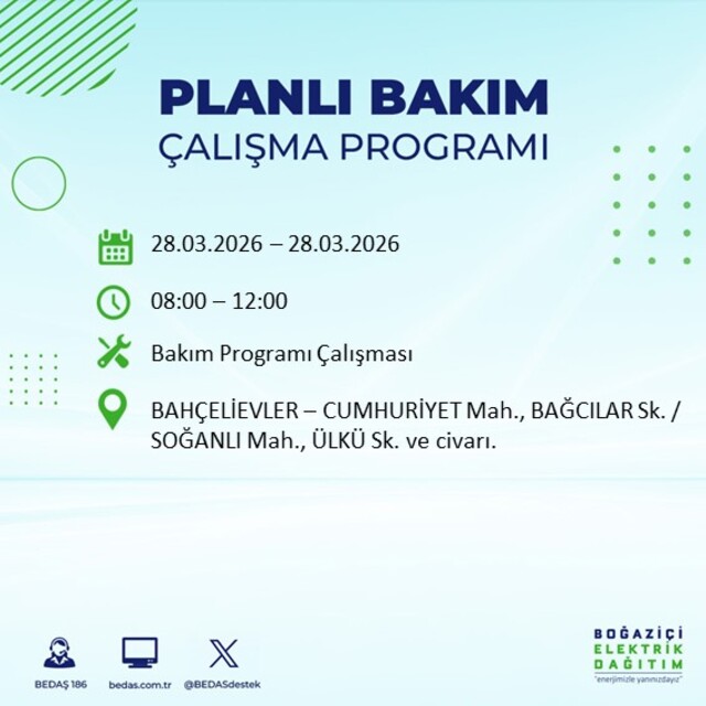 Boğaziçi Elektrik Dağıtım A.Ş tarafından yapılan duyuruya göre 28 Mart Cumartesi günü İstanbul'da farklı saat aralıklarında elektrik kesintileri uygulanacak.