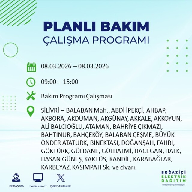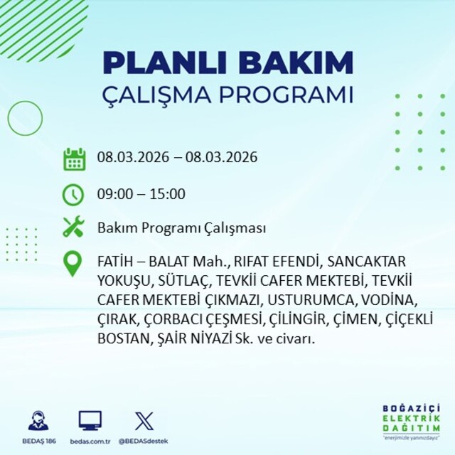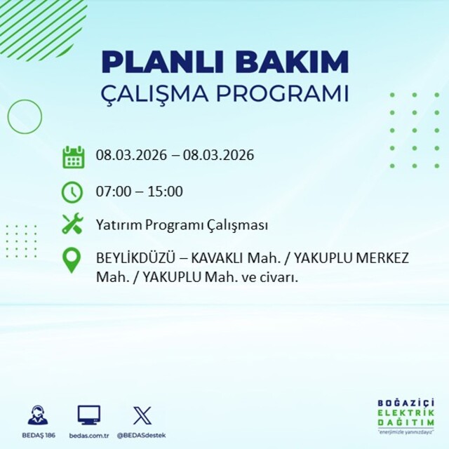 Boğaziçi Elektrik Dağıtım A.Ş tarafından yapılan duyuruya göre 8 Mart 2026 Pazar günü İstanbul'da farklı saat aralıklarında elektrik kesintileri uygulanacak.