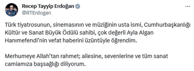 Cumhurbaşkanı Recep Tayyip Erdoğan, yayınladığı taziye mesajıyla üzüntünü dile getirdi; "Türk tiyatrosunun, sinemasının ve müziğinin usta ismi, Cumhurbaşkanlığı Kültür ve Sanat Büyük Ödülü sahibi, çok değerli Ayla Algan Hanımefendi’nin vefat haberini üzüntüyle öğrendim. Merhumeye Allah’tan rahmet; ailesine, sevenlerine ve tüm sanat camiamıza başsağlığı diliyorum.