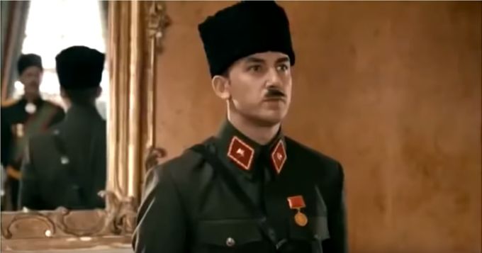 Bir sonraki sahnede Vahideddin, “Tamam!” mânâsında başını sallıyor, karşısındaki acemi de aynı şekilde bir kafa sallamasından sonra yürüyor, kapıyı açıyor ve çıkıp gidiyor! Asker selâmı da, sarayda kapıların odanın dışından açılması âdeti, hak getire… Hattâ, Mustafa Kemal Paşa’nın padişahın fahrî yaveri olduğu ve hükümdarın huzuruna göğsünde yaverlik kordonu olmadan çıkmayacağı bile akıl edilmemiş, yahut kordon masrafından tasarruf maksadıyla Paşa’yı oynayan aceminin göğsüne sağ omuzdan sol aşağıya uzanan bir kemer bağlamışlar!