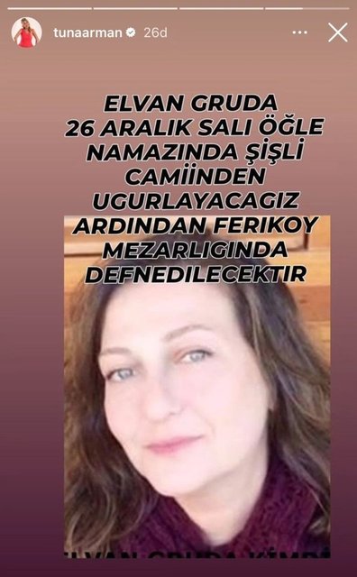 Tuna Arman, Elvan Gruda'nın cenaze törenine ilişkin detayları da paylaştı: 26 Aralık salı öğle namazında Şişli Camii'nden uğurlayacağız. Ardından Feriköy Mezarlığı'na defnedilecektir.