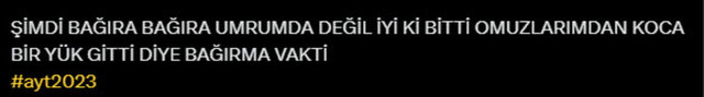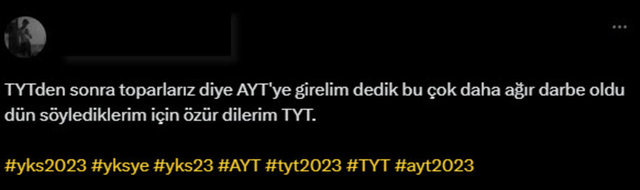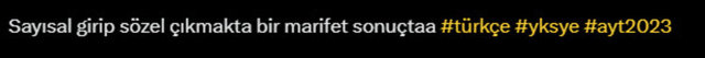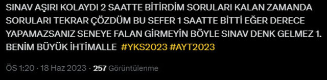 2023 Yükseköğretim Kurumları Sınavı (YKS) kapsamında 2. gün oturumları yapıldı. Adaylar, ikinci gün Alan Yeterlilik Testi (AYT) soruları karşısında ter döktü. AYT'de adaylara Türk Dili ve Edebiyatı-Sosyal Bilimler-1 Testinde 40 soru, Sosyal Bilimler-2 Testinde 40 soru, Matematik Testinde 40 soru, Fen Bilimleri Testinde 40 soru yöneltildi. Sınavın ardından ise sosyal medyadan AYT soru yorumları araştırılıyor. Zira adaylar, sınava katılım gösteren diğer adayların AYT soruları ile ilgili yorumlarını merak ediyor. Peki, 2023 AYT soruları nasıldı, zor muydu kolay mıydı? İşte, sosyal medyadan öne çıkan 2023 AYT sınavı soru yorumları