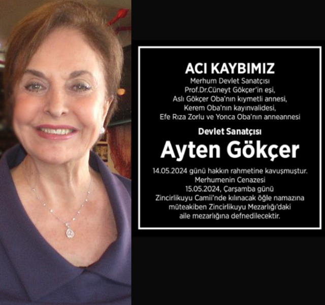 Ayten Gökçer'in kızı Aslı Gökçer Oba, annesinin vefatını "Acı kaybımız... Merhum devlet sanatçısı, Prof. Dr. Cüneyt Gökçer'in eşi, Aslı Gökçer Oba'nın annesi, Kerem Oba'nın kayınvalidesi, Efe Rıza Zorlu ve Yonca Oba'nın anneannesi Ayten Gökçer 14.05.2024 günü hakkın rahmetine kavuşmuştur" sözleriyle duyurdu.