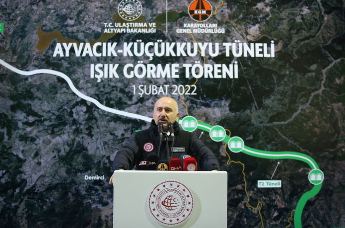 Bakan Karaismailoğlu, Ayvacık T-2 Tüneli Işık Görme Töreni'nde yaptığı konuşmada, ulaşım yatırımları adına yerin 240 metre altında tarihi günlerden birini yaşadıklarını, başta Çanakkale ve Balıkesir olmak üzere bölgeyi etkileyen tüneldeki kazı çalışmalarını tamamladıklarını söyledi.