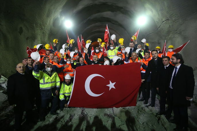 İş makinesini kullanarak tünel delme işlemi gerçekleştiren Karaismailoğlu, ışığın görünmesinin ardından projede görev alan çalışanlarla hatıra fotoğrafı çektirdi.