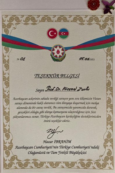 Azerbaycan'ın Türkiye'deki olağanüstü ve tam yetkili büyükelçisi Hazar İbrahim Habertürk Yazarı Prof.Dr. Kürşad Zorlu'ya 1 nolu teşekkür belgesini takdim etti