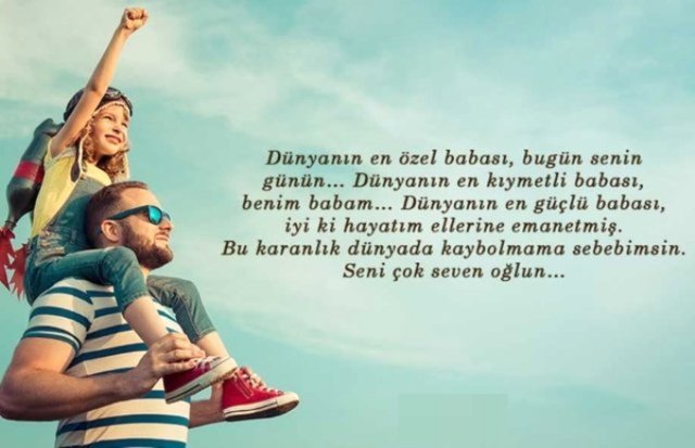Ben daha çocukken, sen de çocuk gibi davranıp benimle oyun oynadığın için, gençliğimde bir derdim olduğunda, beni dinleyip arkadaşım gibi davrandığın için ve ihtiyacım olduğunda ebeveyn gibi davranıp bana akıl verdiğin için sana çok teşekkür ederim. Sen tanıdığım en iyi insansın. Babalar Günün kutlu olsun!