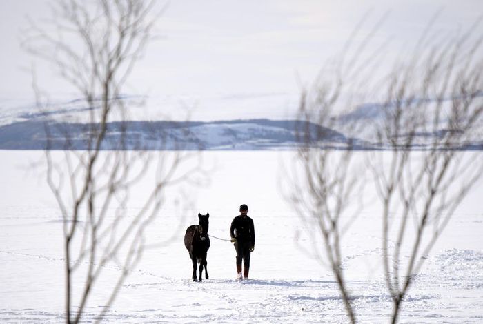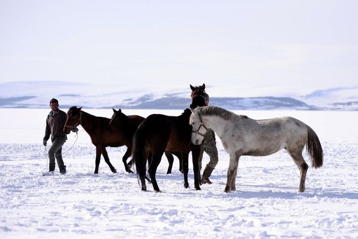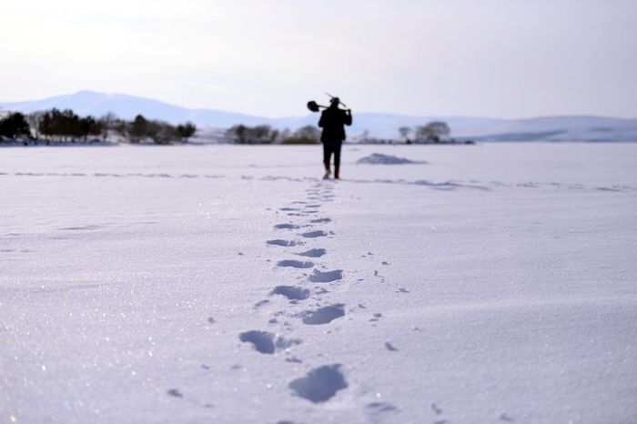 Ardahan'da da Çıldır Gölü çevresi kar yağışıyla beyaza büründü. Buzla kaplı gölün kar örtüsüyle bütünleşmesiyle manzara dikkat çekici hale geldi.