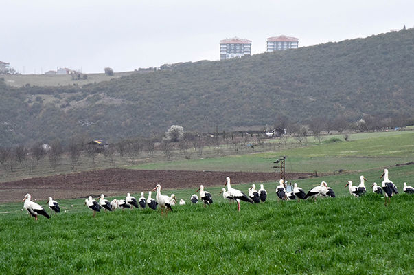 Baharı müjdeleyen leylekler Bilecik'teki sulak arazilerde konakladı