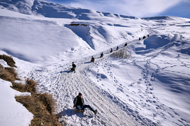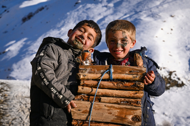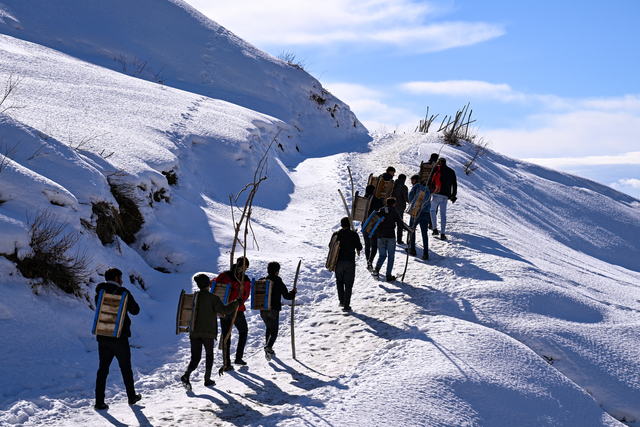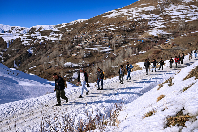 Kar yağışını fırsat bilen mezradaki gençler ve çocuklar, kendi imkanlarıyla yaptıkları tahtadan kızakları sırtlarında taşıyarak her gün 2 kilometre mesafedeki yayla yoluna geliyor.