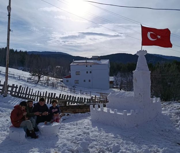 Sivas'ın Koyulhisar ilçesindeki Kızılelma köyünde çocukların kardan Kız Kulesi manzarasında çay içtiği anlar, sosyal medyada büyük beğeni toplamıştı.