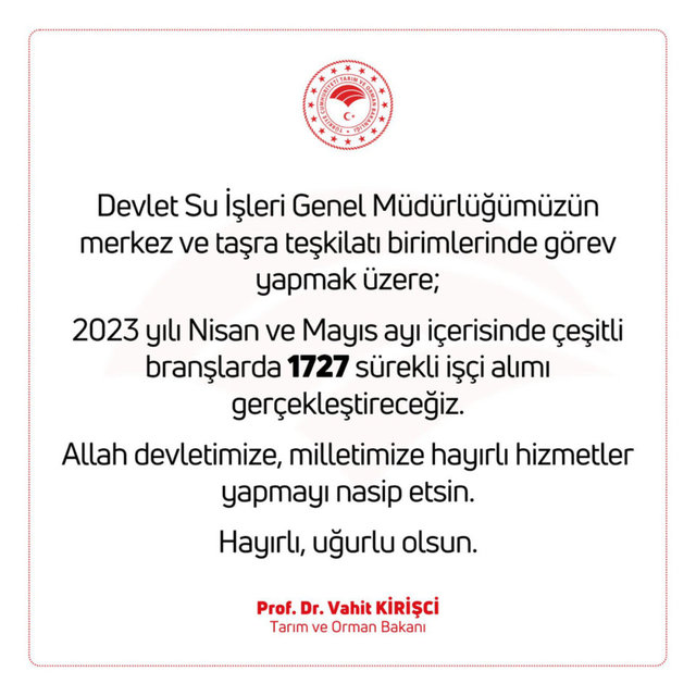 Tarım ve Orman Bakanı Vahit Kirişci, sosyal medya hesabından yaptığı paylaşımda, "Devlet Su İşleri Genel Müdürlüğümüzün merkez ve taşra birimlerinde görev yapmak üzere nisan ve mayıs ayı içerisinde çeşitli branşlarda 1727 sürekli işçi alımı gerçekleştireceğiz. Hayırlı, uğurlu olsun." ifadesini kullandı.