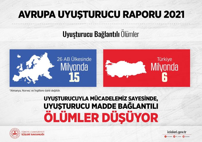 Bakan Soylu, mesajında 'Avrupa Uyuşturucu Raporu 2021'i de paylaştı. Türkiye- Avrupa istatistiklerine göre, ele geçirilen eroin miktarı, 29 Avrupa ülkesinde 8 bin 624 kilo olurken, Türkiye'de 20 bin 165 kilo oldu. 29 Avrupa ülkesinde 5 milyon 444 bin 451, Türkiye'de ise 8 milyon 695 bin 605 ecstasy hap ele geçirildi. 29 Avrupa ülkesinde 3 milyon 686 bin 482 kök kenevir ele geçirilirken, Türkiye'de bu rakam 42 milyon 276 bin 694 oldu.