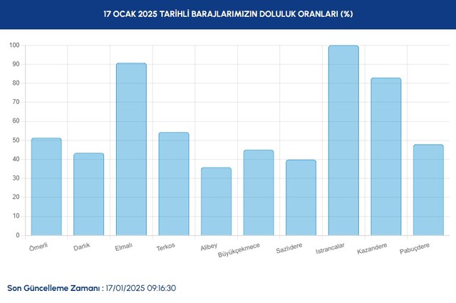 17 Ocak Cuma günü, İstanbul'a su sağlayan 10 barajın toplam doluluk oranı yüzde 50.49 olarak ölçüldü. Önceki güne kıyasla yükselişe geçtiği kaydedilen barajlarda 17 Ocak'ta barajlardaki doluluk oranı şöyle sıralandı: