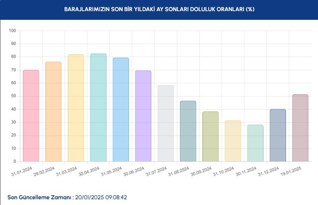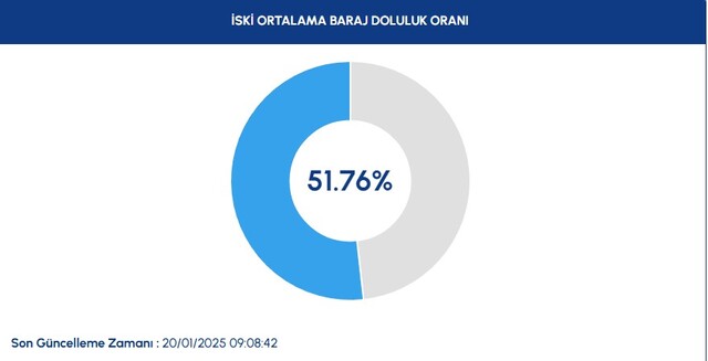 20 Ocak Pazartesi günü, İstanbul'a su sağlayan 10 barajın toplam doluluk oranı yüzde 51.76 olarak ölçüldü. Önceki güne kıyasla yükselişe geçtiği kaydedilen barajlarda 20 Ocak'ta barajlardaki doluluk oranı şöyle sıralandı:
