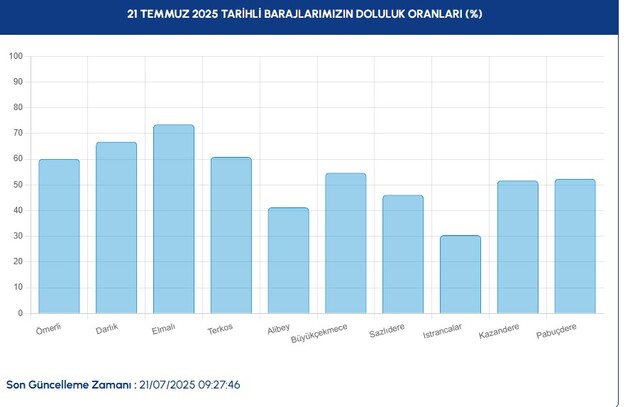 İstanbul'daki baraj doluluk oranı İSKİ tarafından duyuruldu. Yaz ve kış aylarında yağışların azalması veya artmasıyla birlikte barajlardaki su seviyesi değişiyor. Ömerli, Elmalı, Terkos, Alibeyköy, Sazlıdere, Büyükçekmece, Istrancalar gibi kente su sağlayan barajların günlük doluluk oranları, İSKİ tarafından güncelleniyor. Peki, 21 Temmuz İstanbul'da baraj doluluk oranı yüzde kaç oldu?